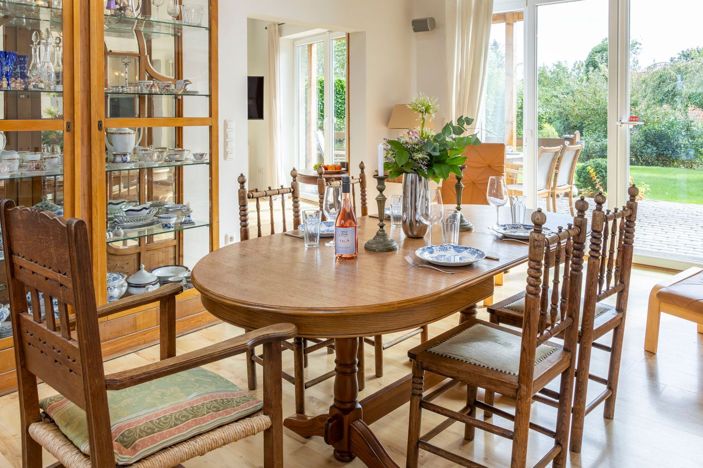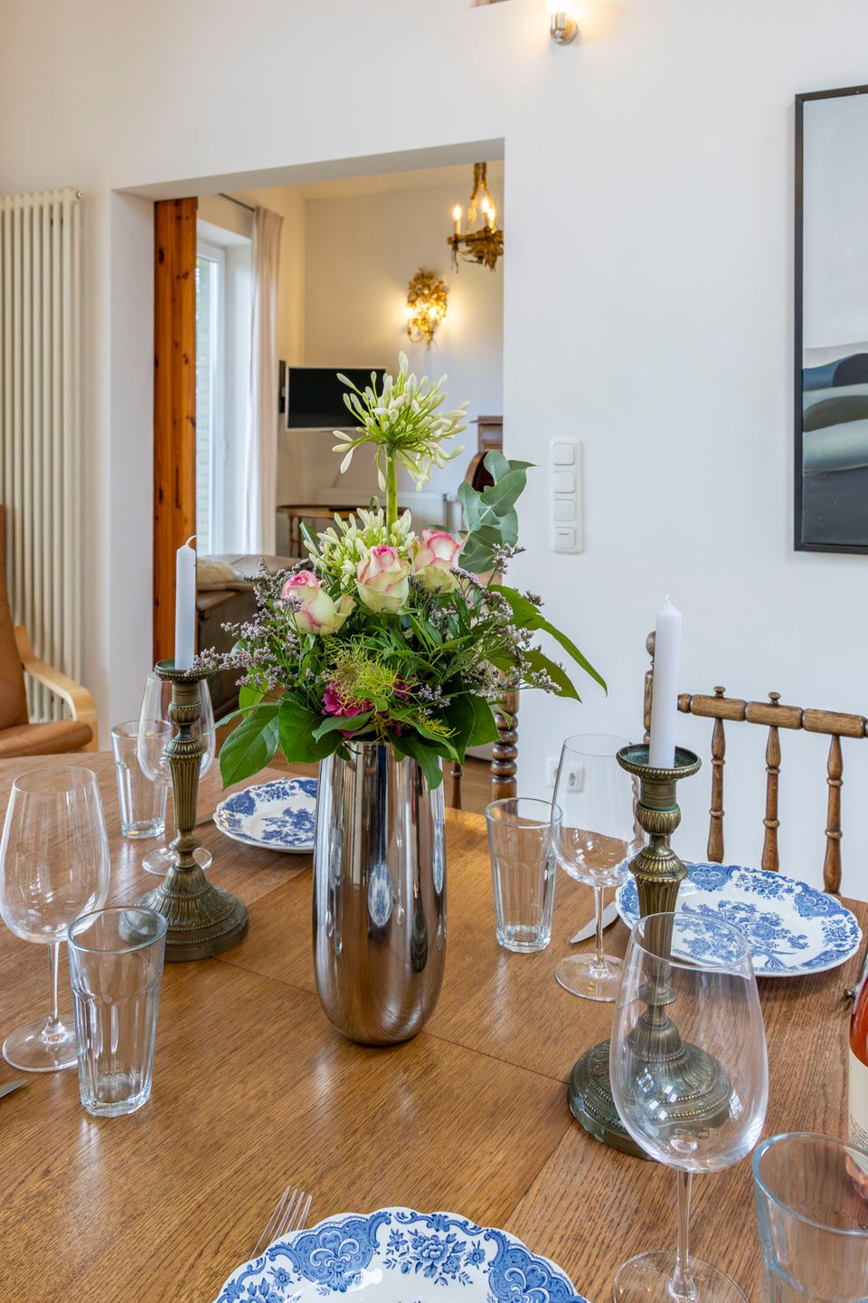 Die offene, moderne Küche ist in den Wohnraum mit großzügigem Esstisch integriert und bietet alles, was für die Zubereitung gemeinsamer Mahlzeiten benötigt wird: Cerankochfeld, Backofen, Kühlschrank mit Gefrierfach, Geschirrspüler, Nespresso-Espressomaschine, Kaffeevollautomat, Wasserkocher, Toaster, Mixer und umfassende Küchenutensilien sowie Geschirr und Besteck. So können Sie sich flexibel selbst versorgen und müssen auf keinerlei Komfort verzichten.