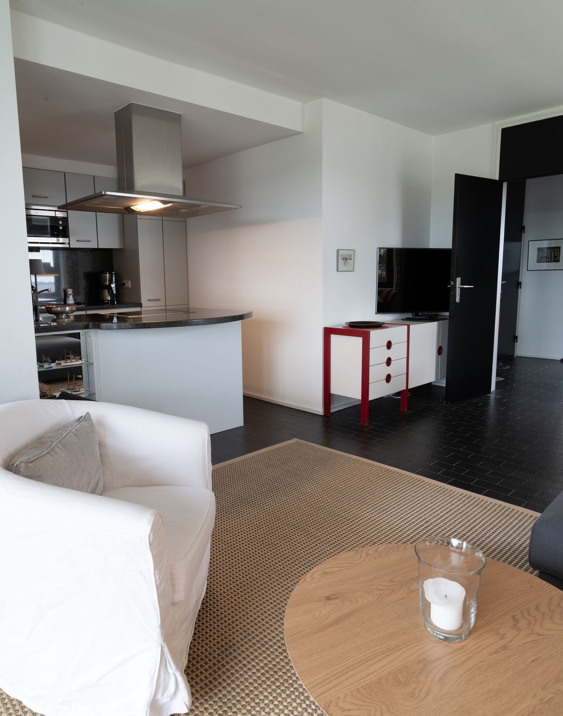Die moderne Küche ist mit hochwertigen Geräten ausgestattet, darunter ein Cerankochfeld, Backofen, Spülmaschine und Mikrowelle, wodurch das Zubereiten von Mahlzeiten zum Vergnügen wird. Außerdem finden Sie hier alle nötigen Küchenutensilien und Geschirr, um Ihren kulinarischen Vorlieben freien Lauf zu lassen. Die offene Küche erlaubt zudem eine optimale Kommunikation zwischen den Kochenden und den Gästen im Wohnbereich.