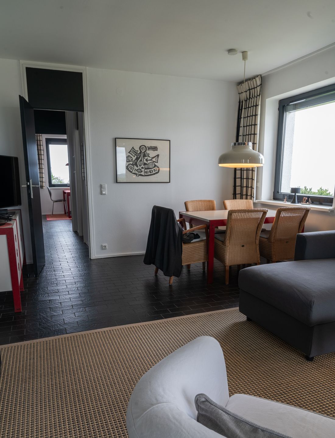 Der offene Wohnbereich mit einer gemütlichen Sofaecke lädt zum Verweilen ein und ist ideal, um die gemeinsamen Stunden mit Freunden oder Familie zu genießen. Für Dinierfreunde steht ein Esstisch bereit, an dem gesellige Abende stattfinden können.
