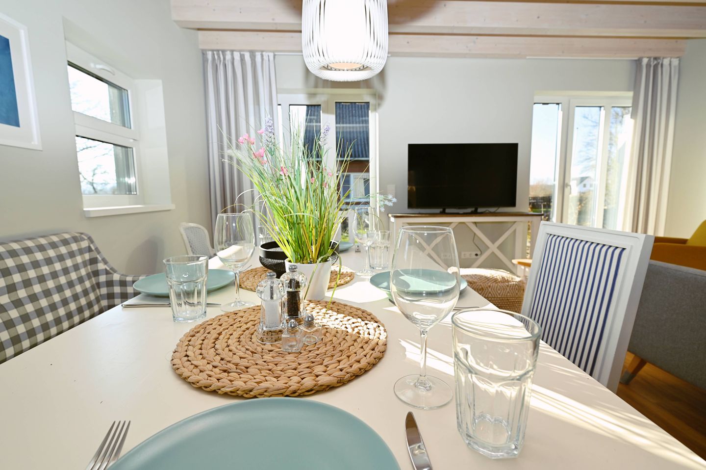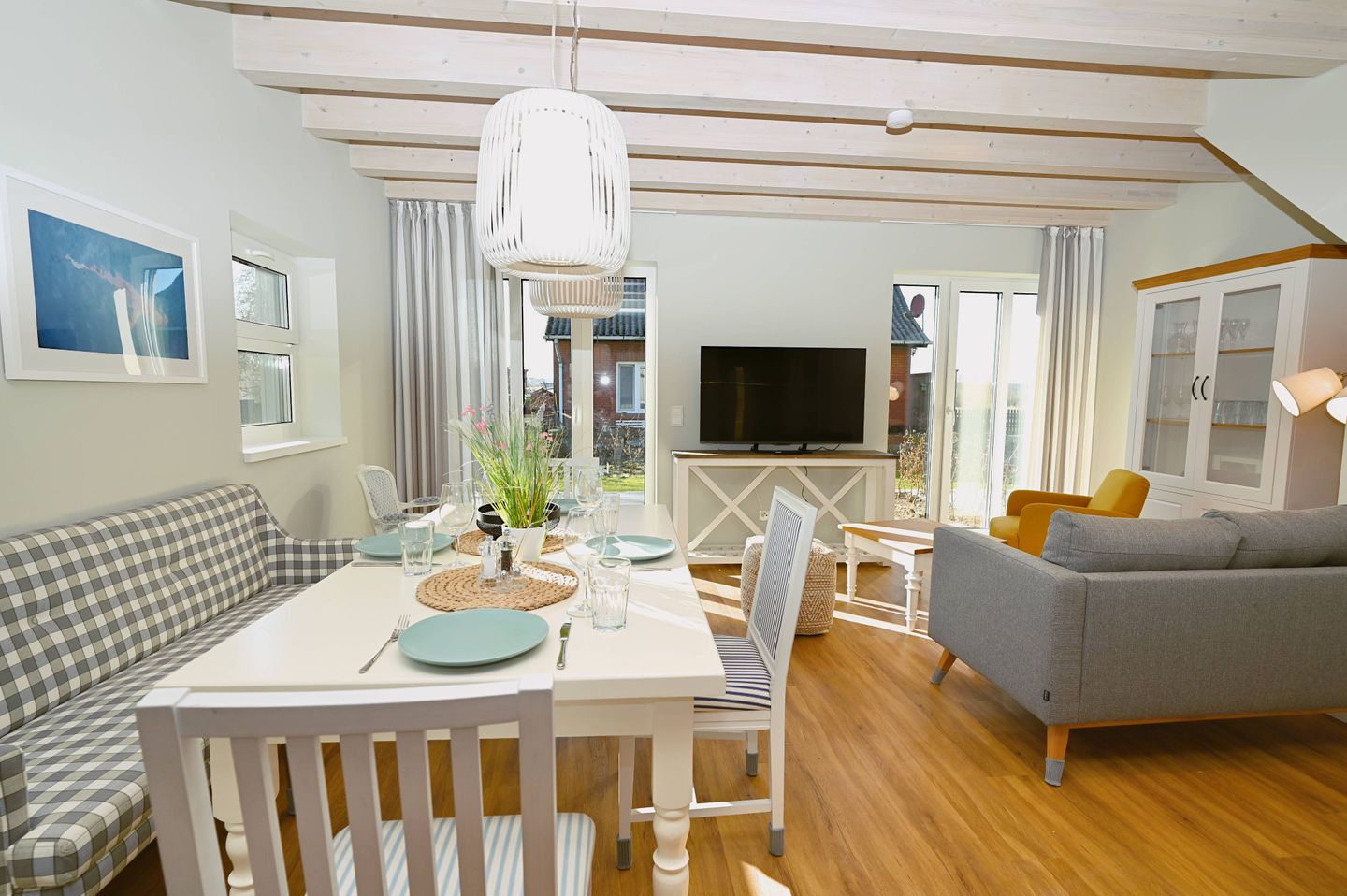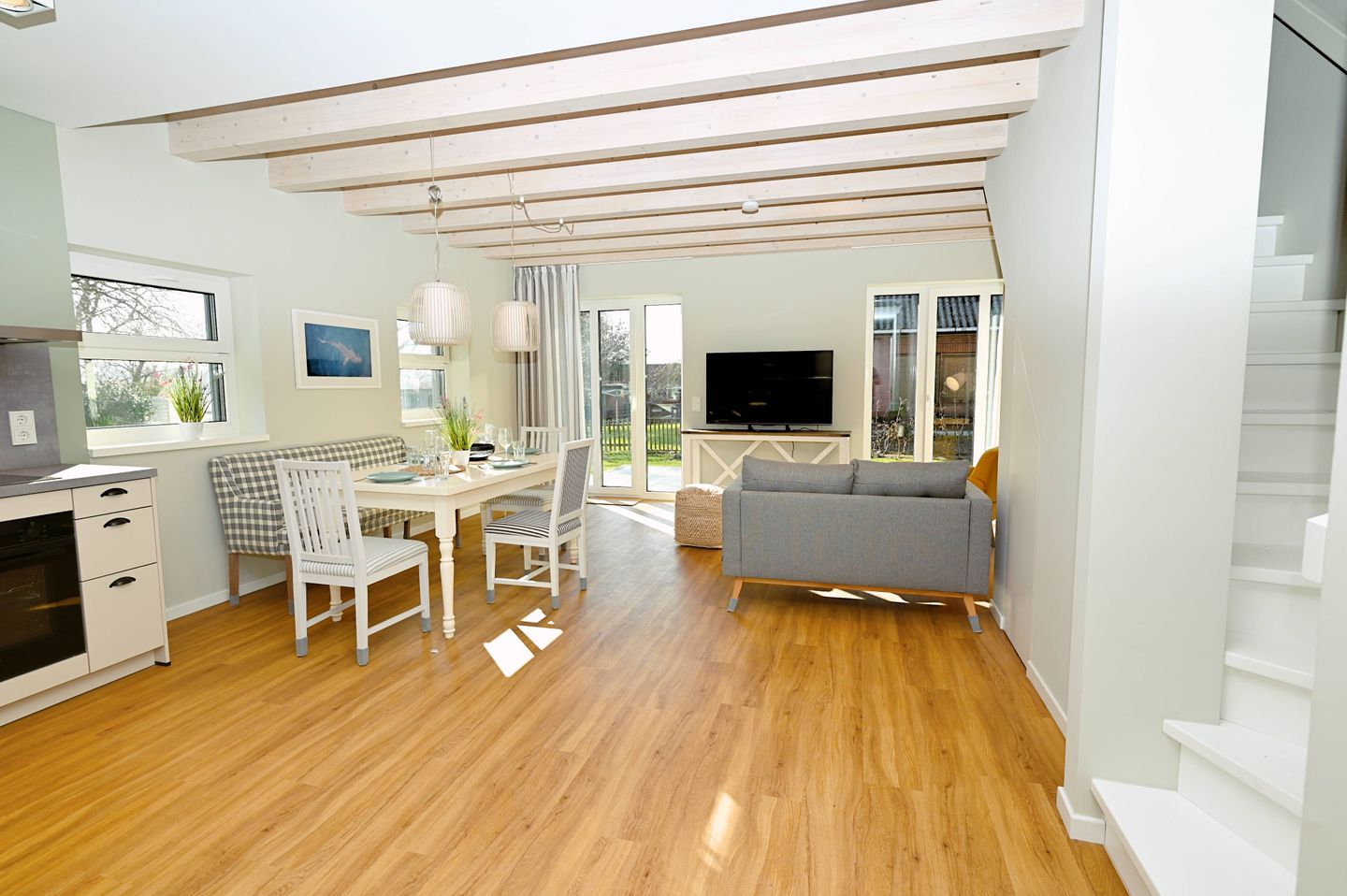 Im Inneren erwartet Sie ein durchdachter Wohnbereich mit Sofa, Sessel, Sofaecke, Esstisch und Essbereich. Die offene Küche ist direkt zum Wohnzimmer hin gestaltet und gut in den Wohnraum integriert. Zur Ausstattung gehören Cerankochfeld, Backofen, Kühlschrank mit Gefrierfach, Spülmaschine, Kaffeemaschine, Kaffeevollautomat, Wasserkocher, Toaster, Mixer sowie Küchenutensilien, Geschirr und Besteck. Damit ist die Unterkunft gut für die komfortable Selbstversorgung im Urlaub ausgestattet.