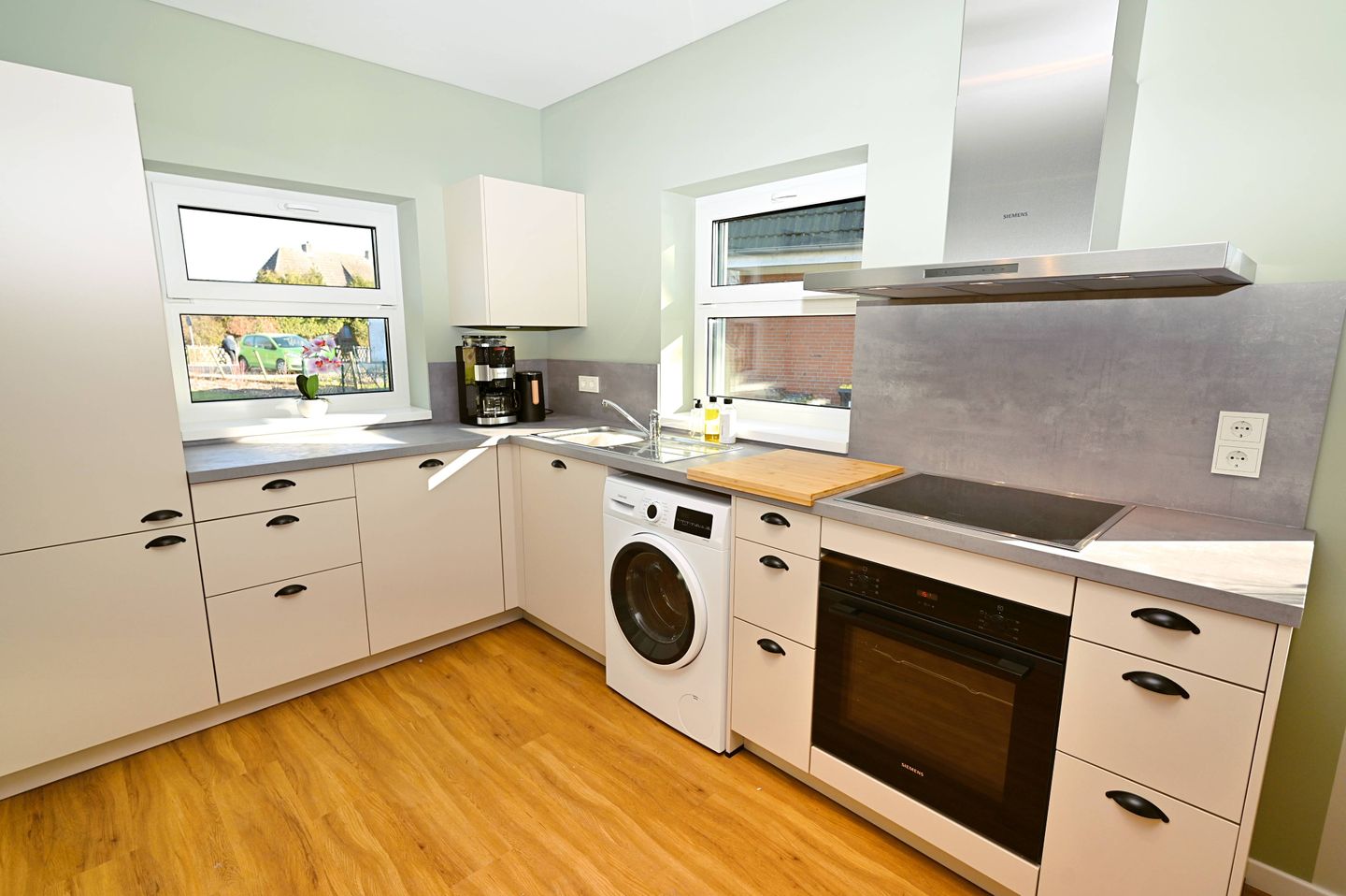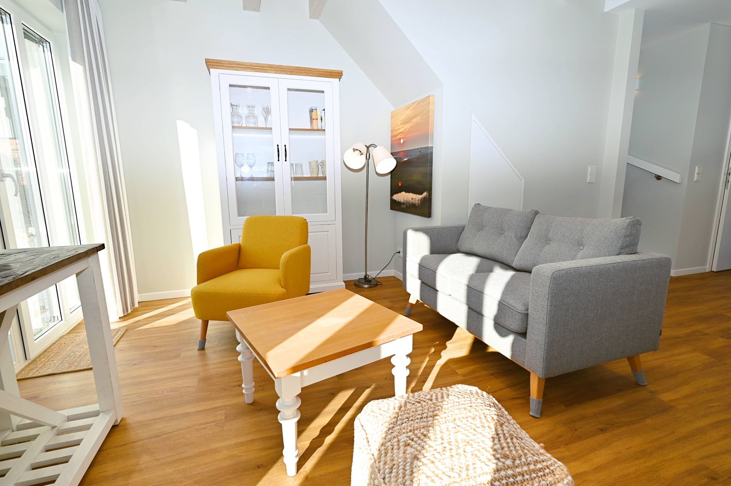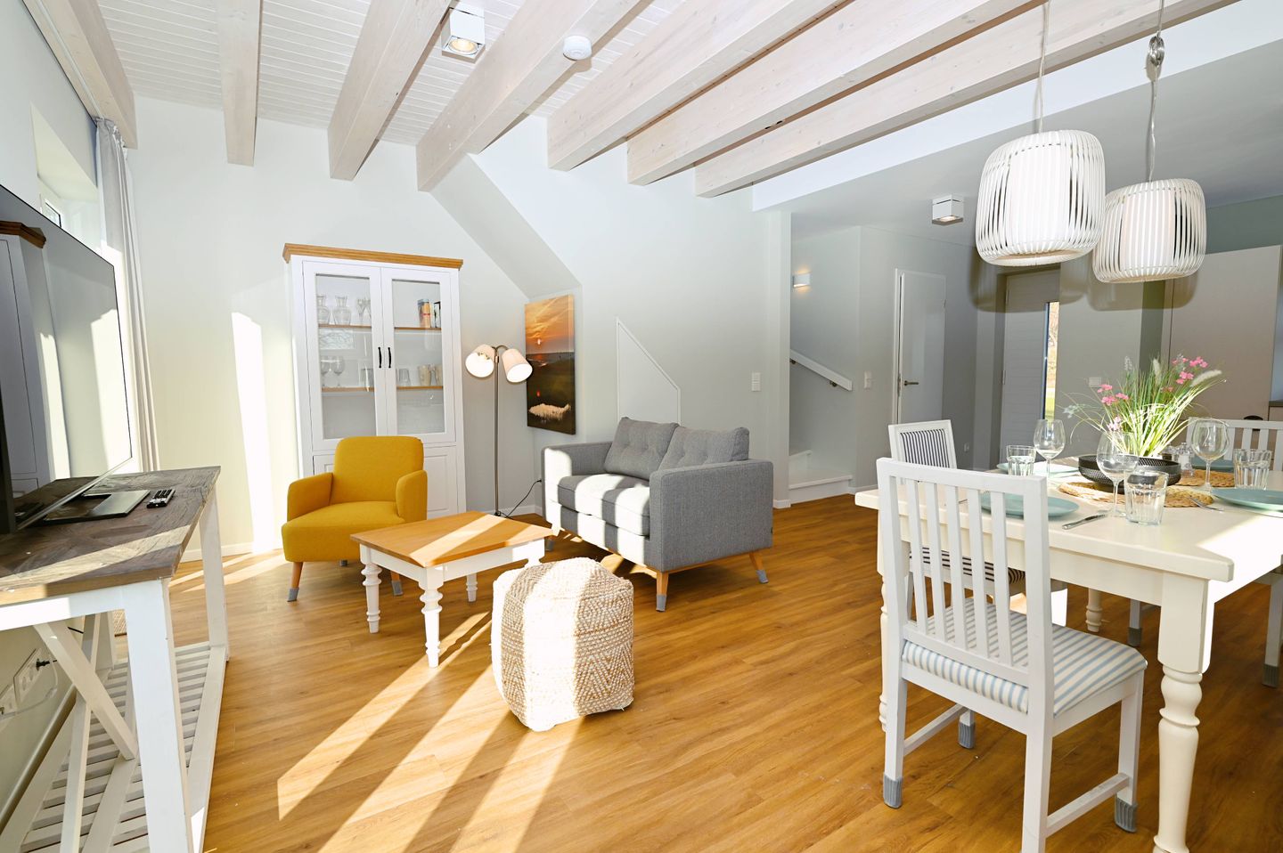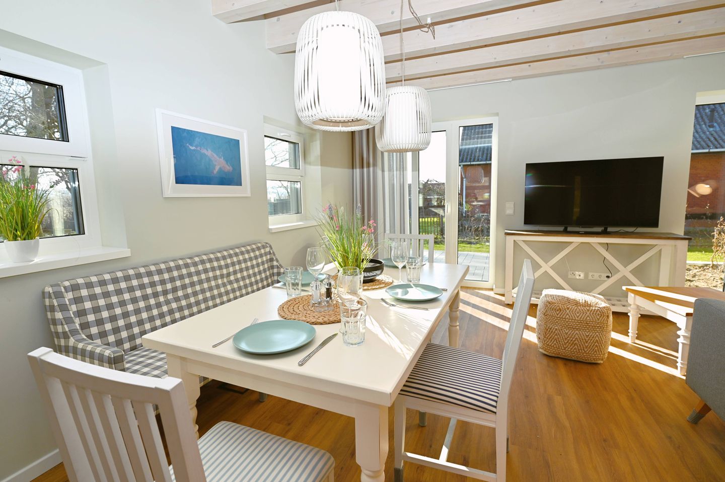 Im Inneren erwartet Sie ein durchdachter Wohnbereich mit Sofa, Sessel, Sofaecke, Esstisch und Essbereich. Die offene Küche ist direkt zum Wohnzimmer hin gestaltet und gut in den Wohnraum integriert. Zur Ausstattung gehören Cerankochfeld, Backofen, Kühlschrank mit Gefrierfach, Spülmaschine, Kaffeemaschine, Kaffeevollautomat, Wasserkocher, Toaster, Mixer sowie Küchenutensilien, Geschirr und Besteck. Damit ist die Unterkunft gut für die komfortable Selbstversorgung im Urlaub ausgestattet.