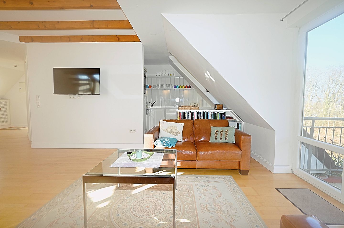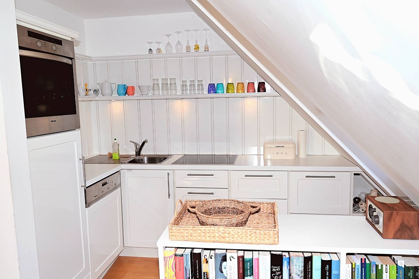 Die offen zum Wohnzimmer gestaltete Küche ist funktional ausgestattet und unterstützt eine unkomplizierte Selbstversorgung. Zur Verfügung stehen Ihnen unter anderem ein Ceranherd mit Elektro-Backofen, eine Spülmaschine, ein Kühlschrank mit Gefrierfach, Kaffeemaschine, Wasserkocher, Toaster, Mixer sowie Küchenutensilien, Geschirr und Besteck.