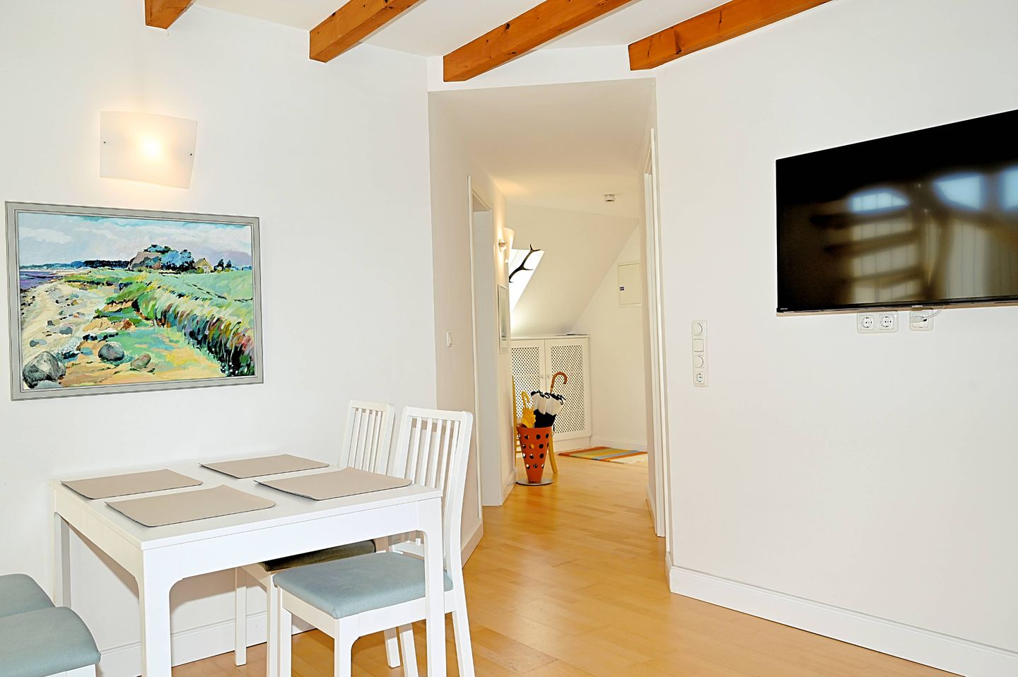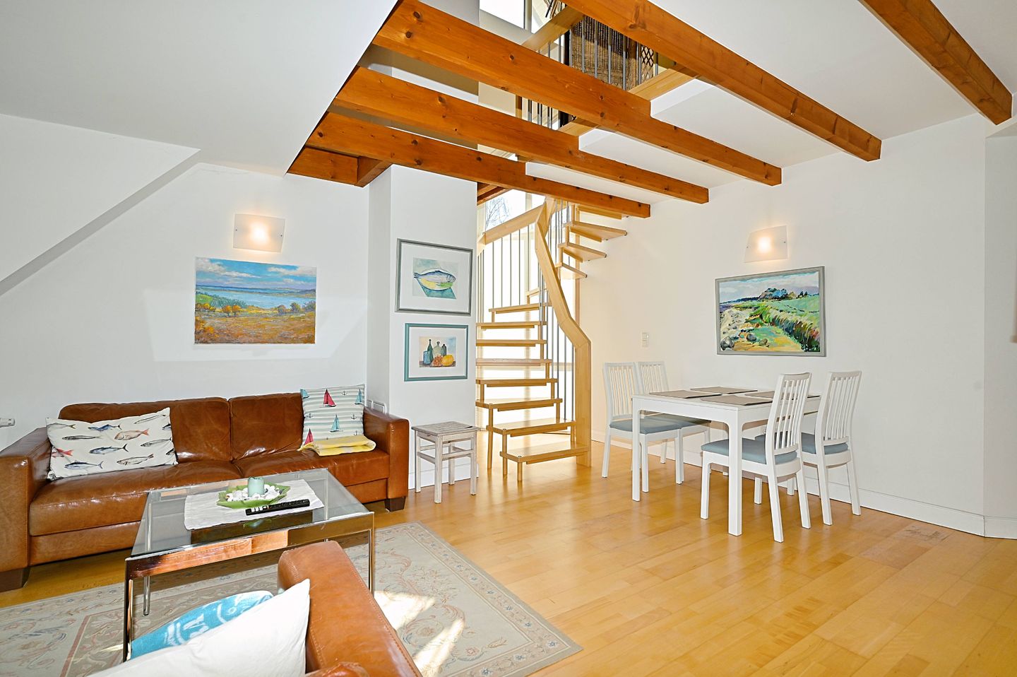 Die Unterkunft befindet sich im 1. Stock und erstreckt sich über 2 Ebenen innerhalb des Appartements. Der Wohnbereich ist offen und einladend gestaltet. Eine Sofaecke mit 2 Sofa`s, TV, Radio, Büchern und Spielen schafft einen angenehmen Rahmen für erholsame Stunden. Dank WLAN und Internetzugang bleiben Sie auch während Ihres Aufenthalts flexibel. Der Essbereich mit Esstisch bietet Ihnen einen praktischen Platz für gemeinsame Mahlzeiten oder einen entspannten Start in den Tag.