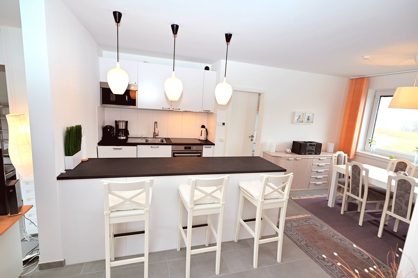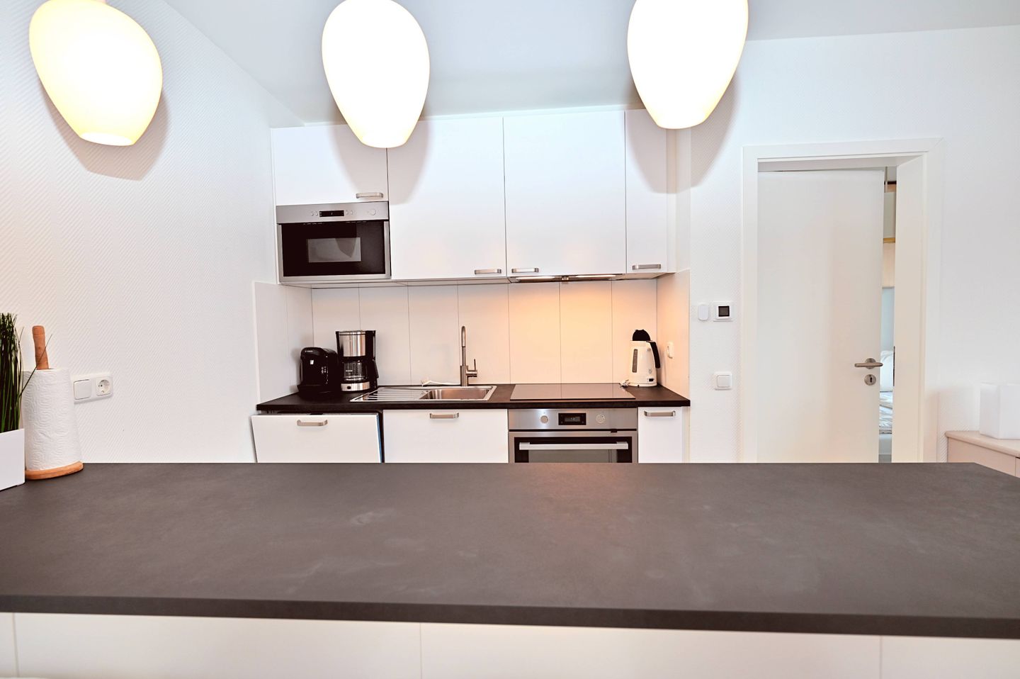 Es gibt einen Kühlschrank, Gefrierschrank mit 3 Schubladen, einen Backofen, sogar Backpapier war vorhanden, eine Mikrowelle, Kaffeemaschine.....