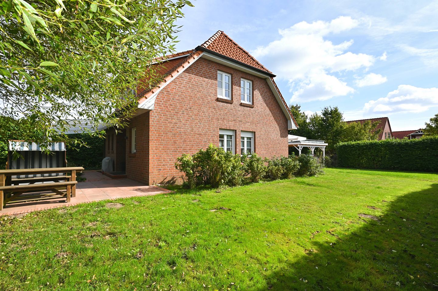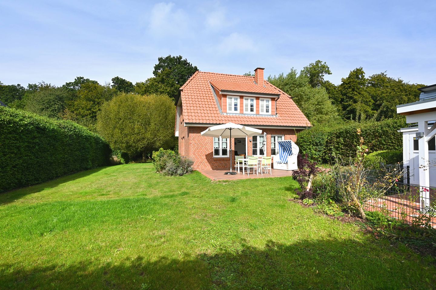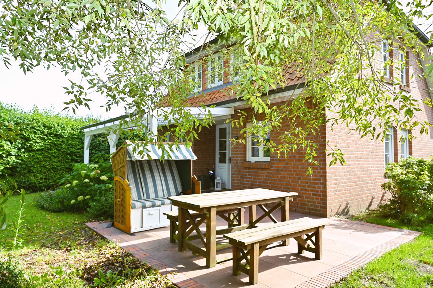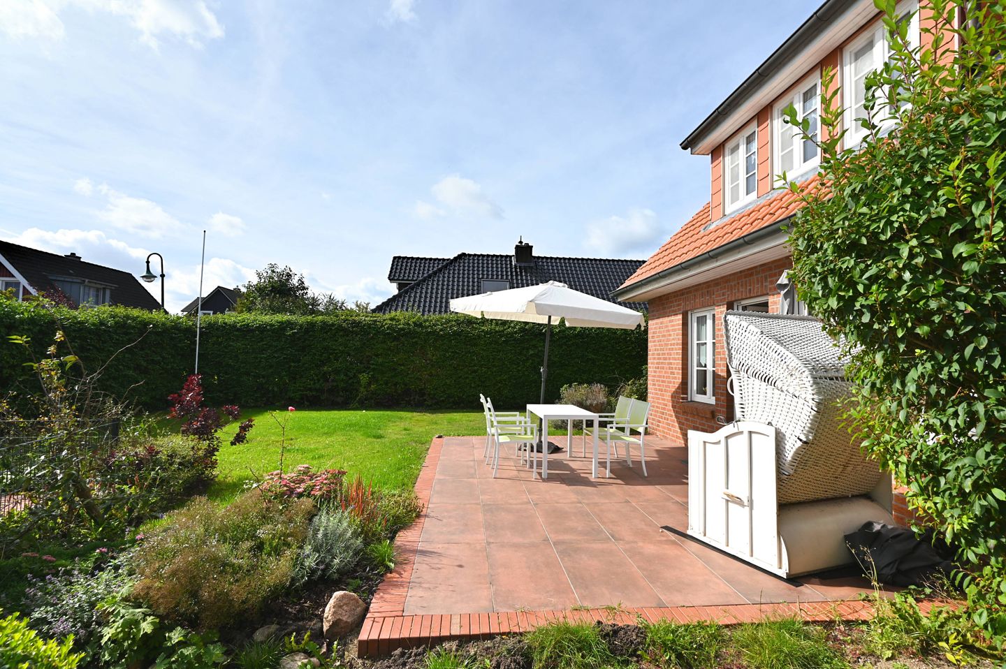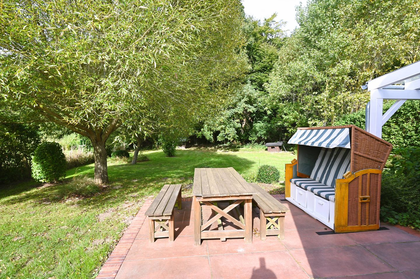 Der eingezäunte Garten verfügt über eine 1200 qm großzügige Liegewiese. Die Terrasse ist mit Strandkorb, Gartenmöbeln und Sonnenliegen ausgestattet.