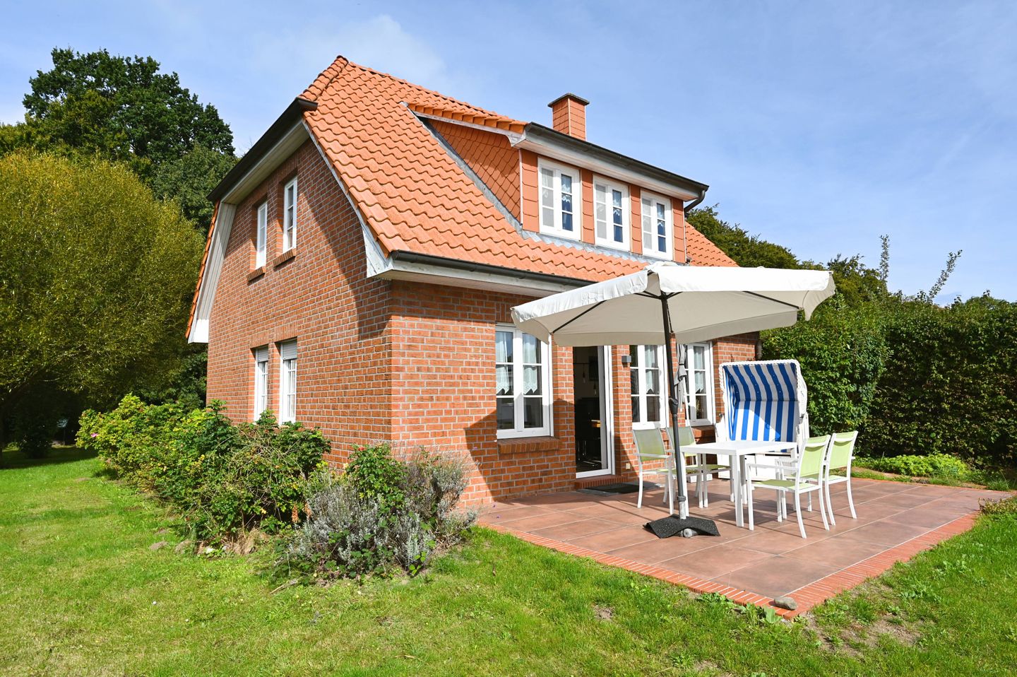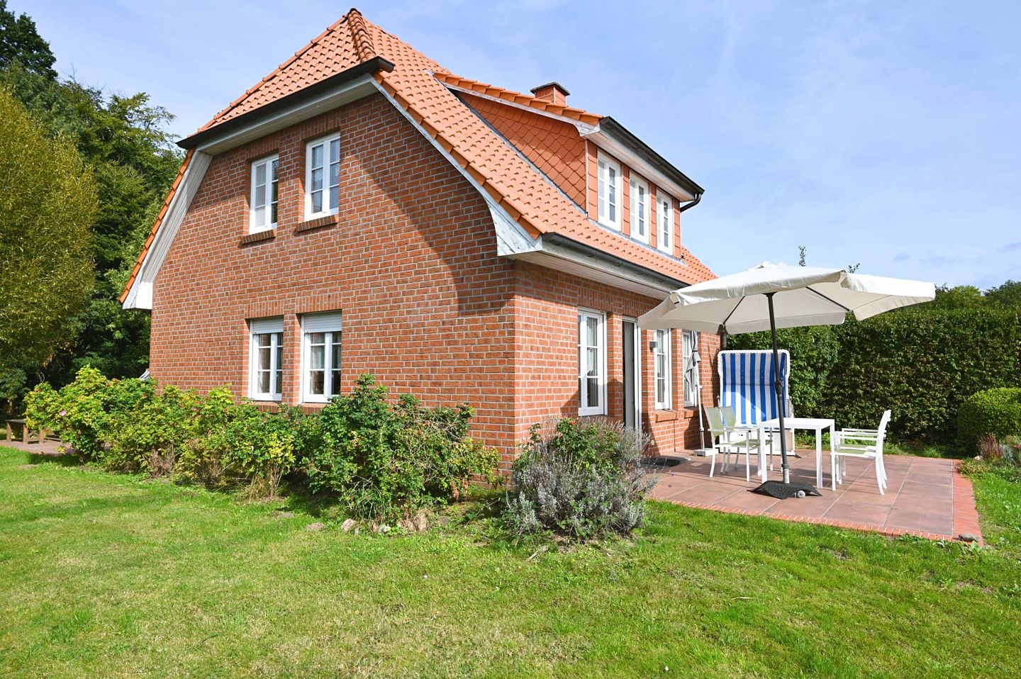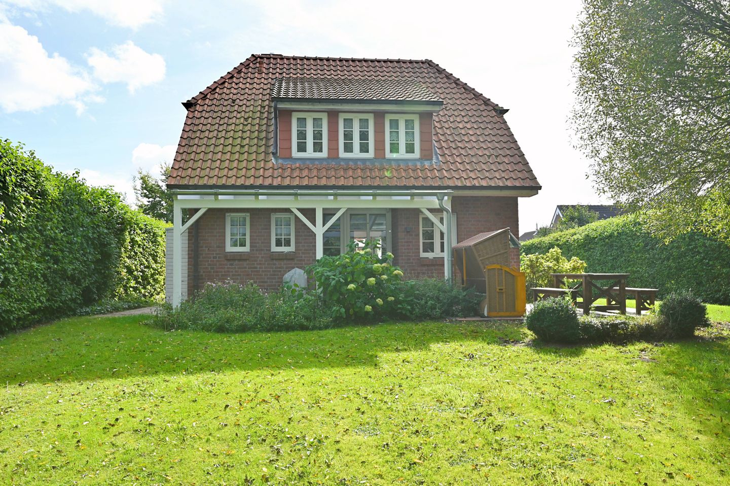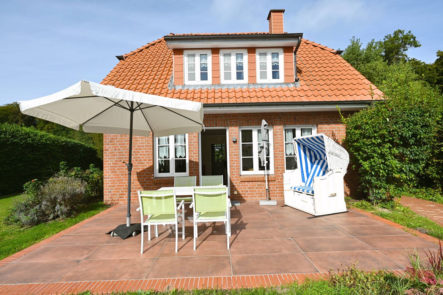 Der eingezäunte Garten verfügt über eine 1200 qm großzügige Liegewiese. Die Terrasse ist mit Strandkorb, Gartenmöbeln und Sonnenliegen ausgestattet.