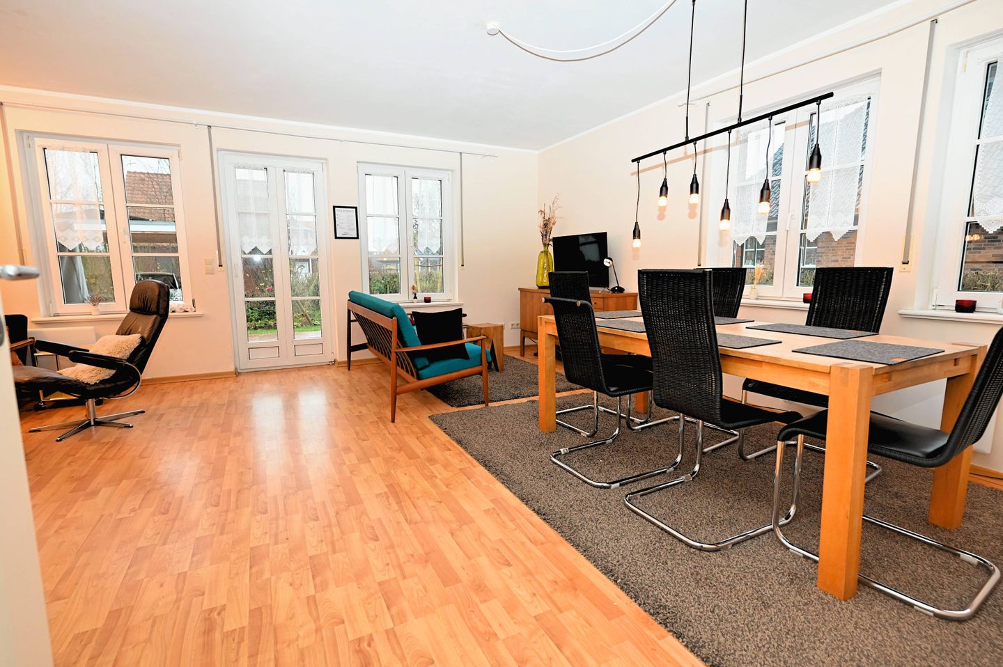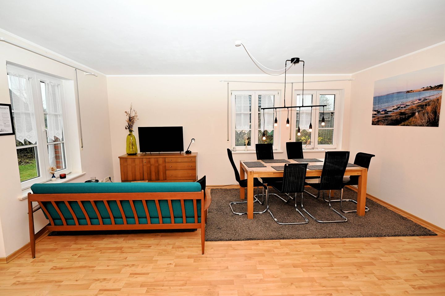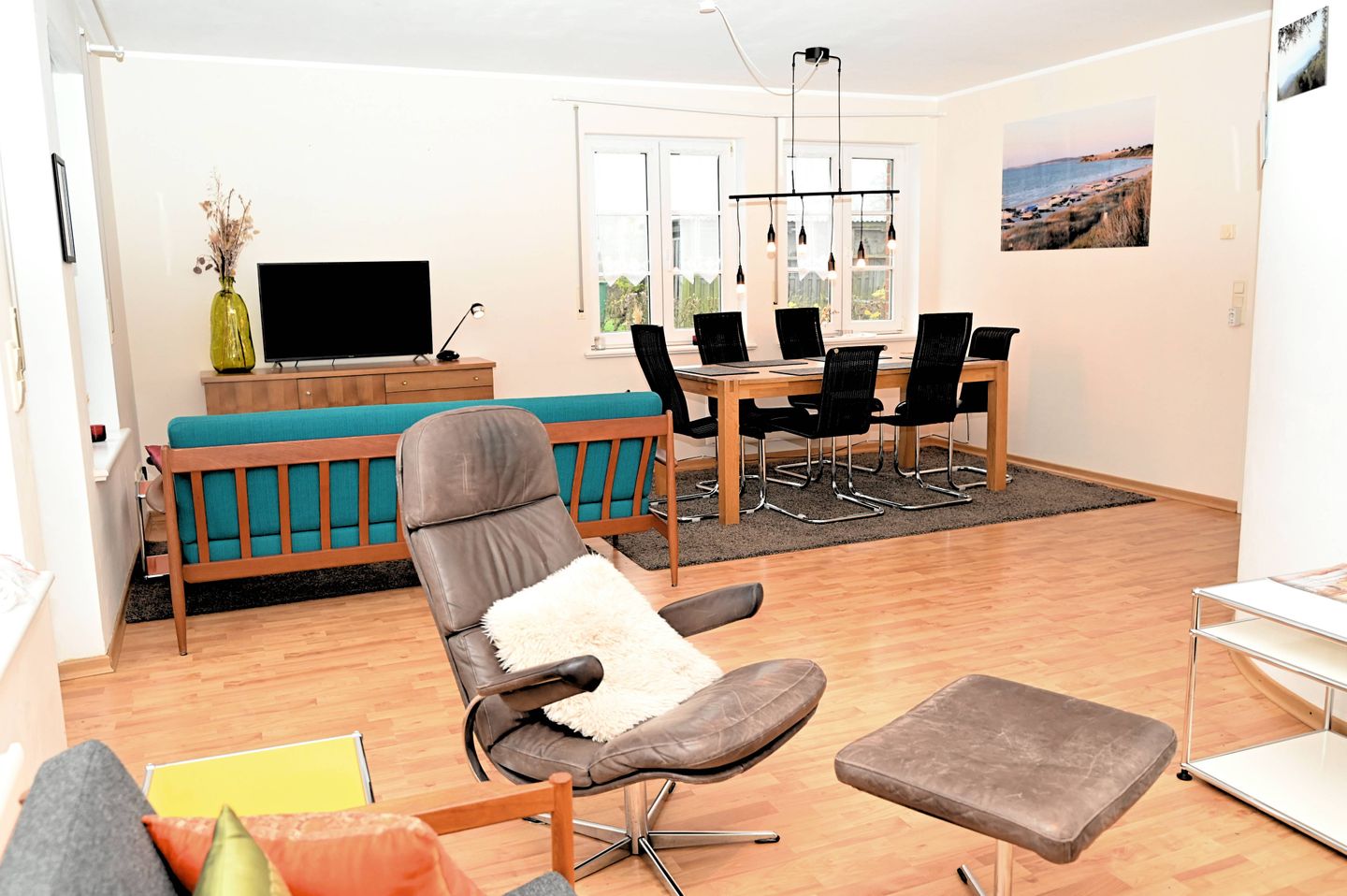 Der Couchbereich im Wohnzimmer ist mit angrenzendem Esstisch ausgestattet.