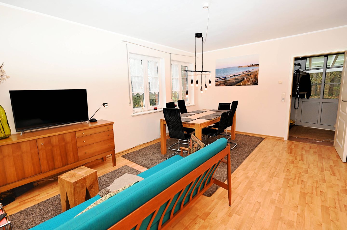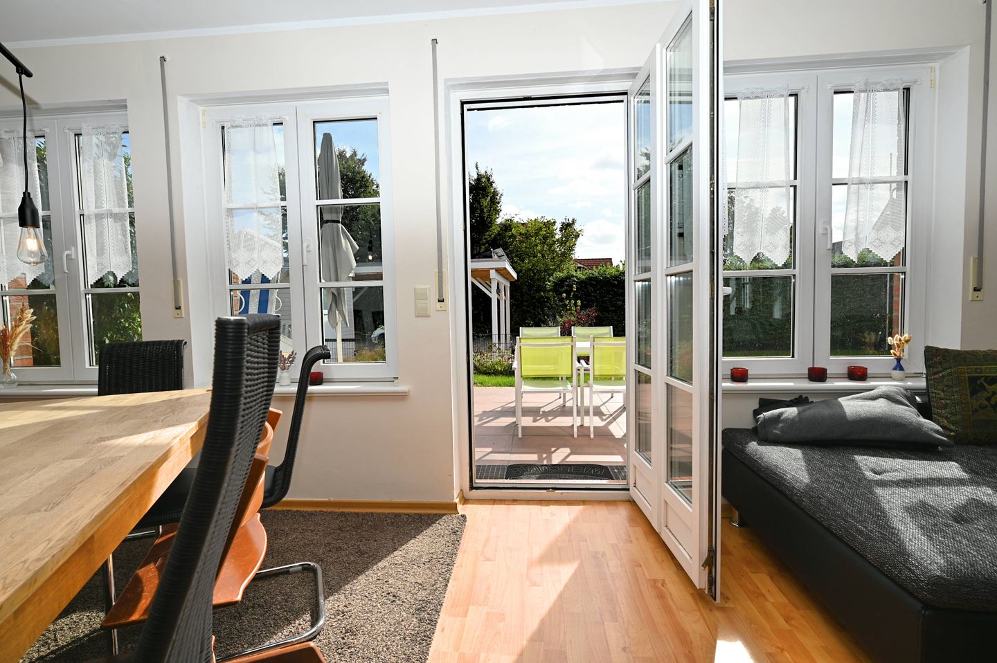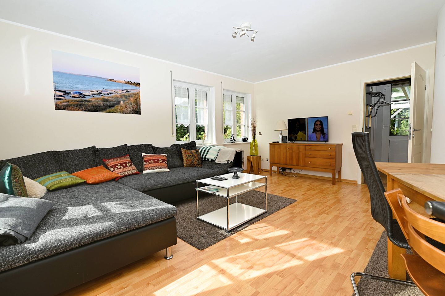 Der Couchbereich im Wohnzimmer ist mit angrenzendem Esstisch ausgestattet.