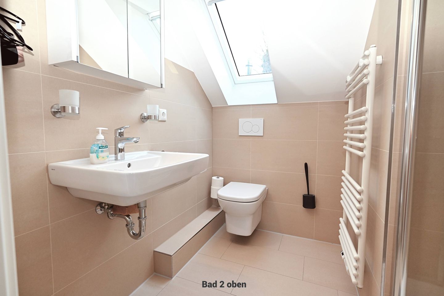 Zwei modern ausgestattete Badezimmer – beide mit bodengleicher Dusche, WC, Waschbecken und Spiegel – sorgen für zusätzlichen Komfort. Zur Ausstattung zählen auch ein Ganzkörperspiegel sowie Haartrockner. Die Waschmaschine und der Trockner stehen zur Eigennutzung bereit, ein Wäscheständer ist ebenfalls vorhanden; so bleiben Sie auch während längerer Aufenthalte flexibel.