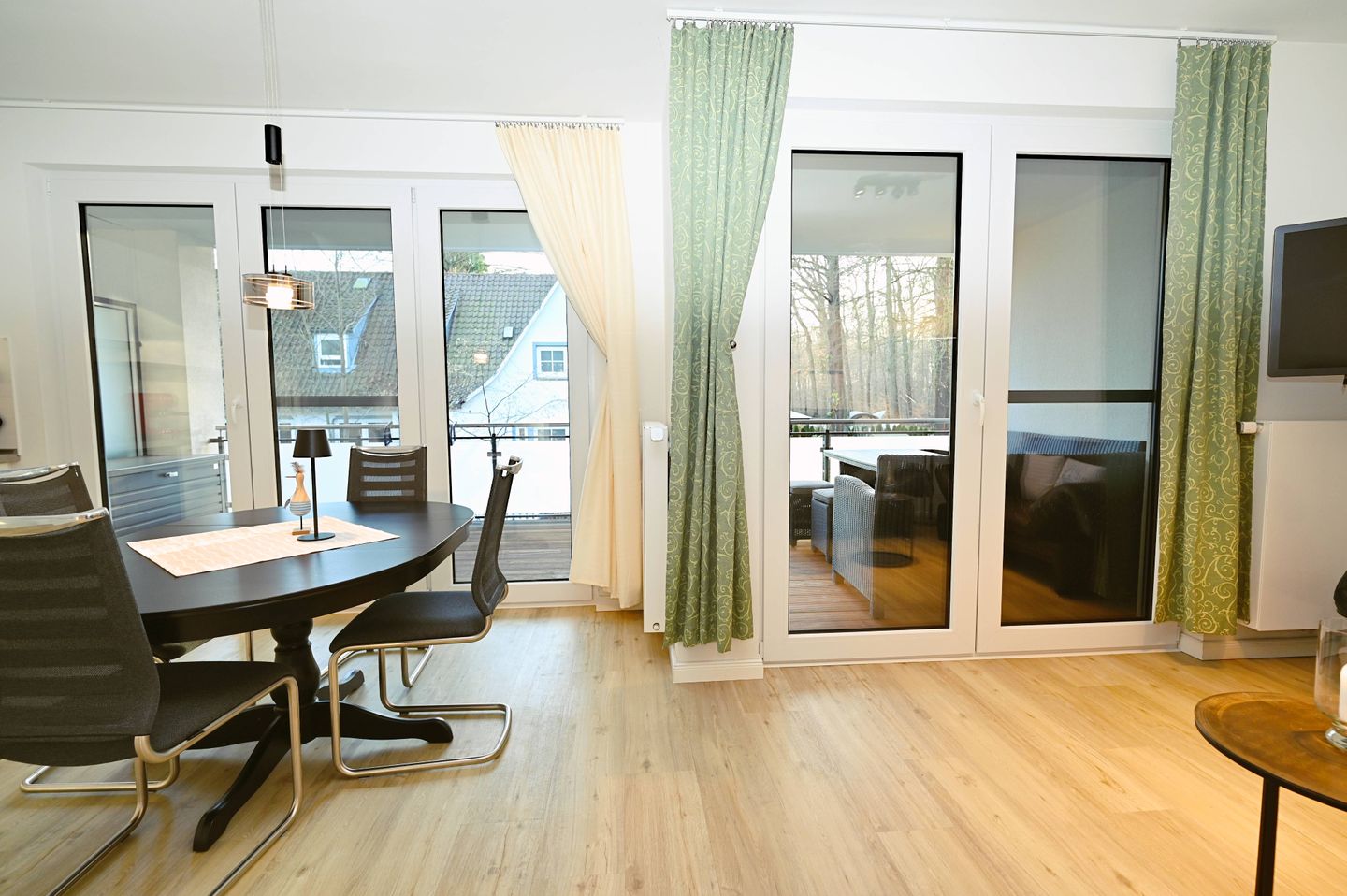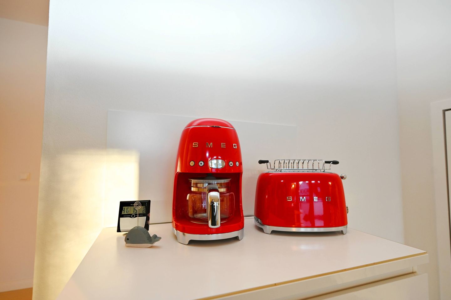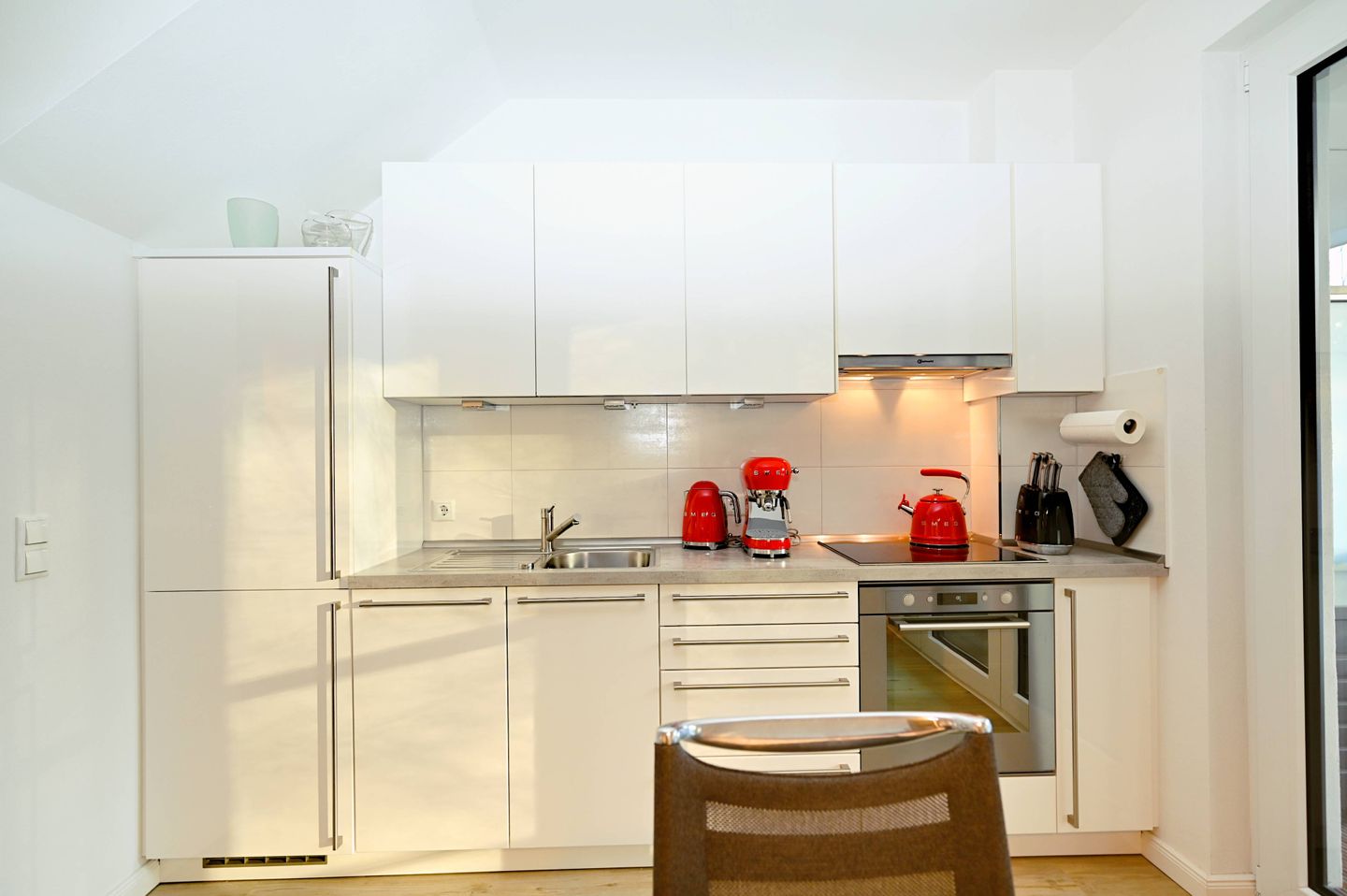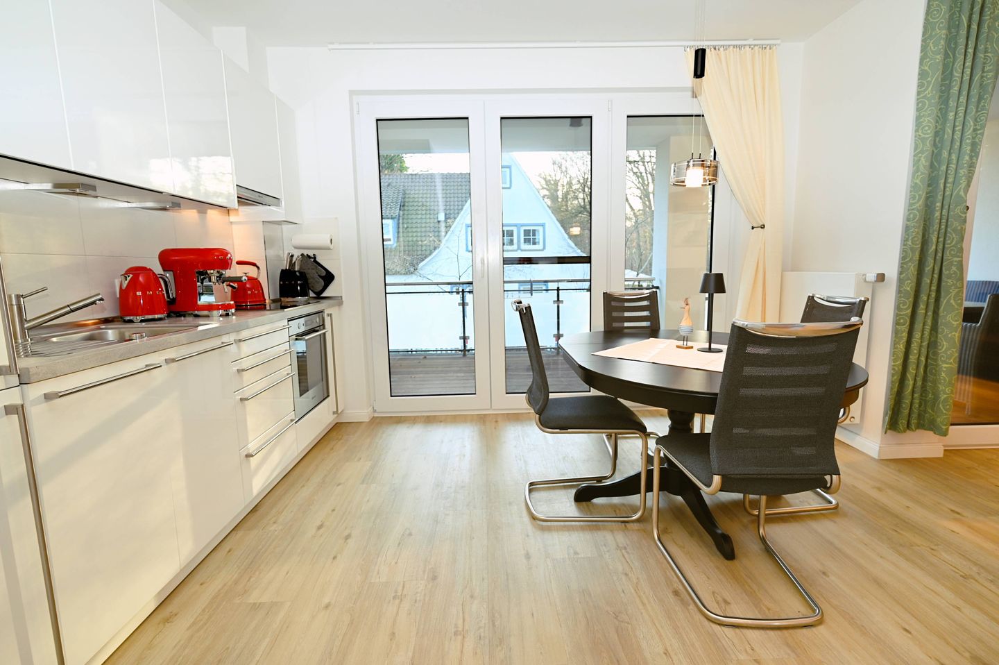 Mit einer großzügigen Wohnfläche von 110 m² auf zwei Etagen bietet die Ferienwohnung ausreichend Raum für bis zu sechs Personen. Drei separate Schlafzimmer schaffen Privatsphäre und Rückzugsmöglichkeiten, was insbesondere für Familien mit Kindern oder gemeinsam reisende Paare attraktiv ist. Die offene Küche ist zum Wohnzimmer hin ausgerichtet und mit modernen Geräten ausgestattet: Ceranherd, Backofen, extra Gefrierschrank, Kühlschrank, Spülmaschine, Kaffeemaschine, Espressomaschine (Smeg Retro Style Espresso Maschine), Wasserkocher und Toaster stehen ebenso zur Verfügung wie umfangreiche Küchenutensilien und Geschirr. Ein Essbereich mit ausreichend Platz grenzt direkt an, sodass das gemeinsame Kochen und Essen zu einem entspannten Erlebnis wird.