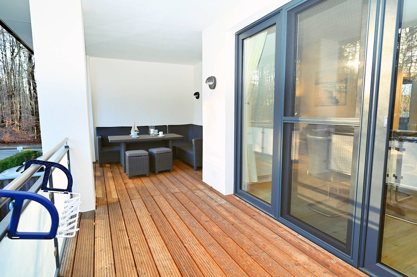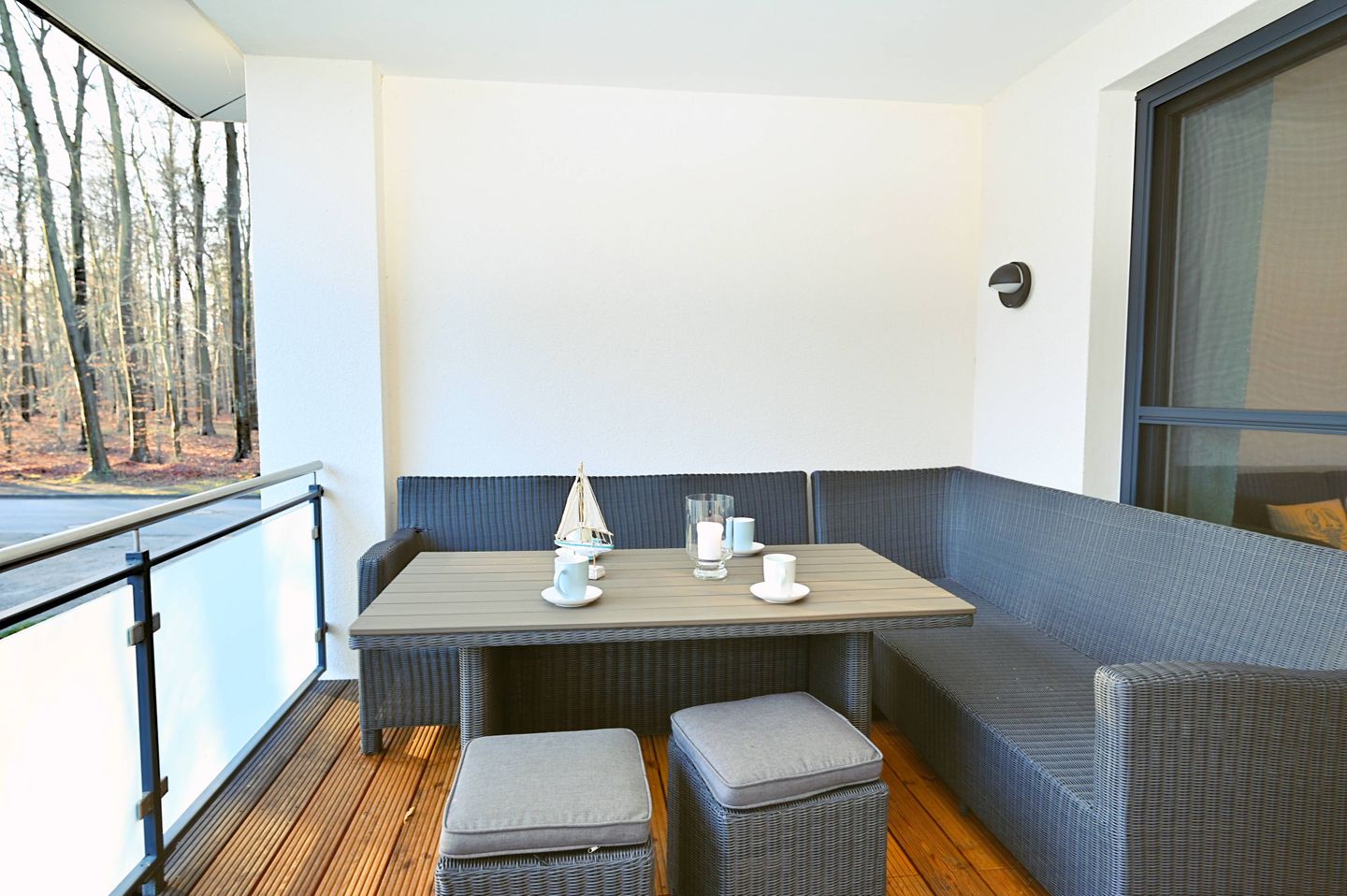 Hervorzuheben ist der überdachte Balkon, ausgestattet mit Gartenmöbeln. Hier können Sie geschützt und unabhängig vom Wetter die großzügige Umgebung genießen. Die Lage in einer geschützten Bucht sowie unmittelbare Strandnähe machen das Ferienhaus zu einem idealen Ausgangspunkt für Badevergnügen, Spaziergänge am Sandstrand und zahlreiche Freizeitmöglichkeiten an der Ostsee.